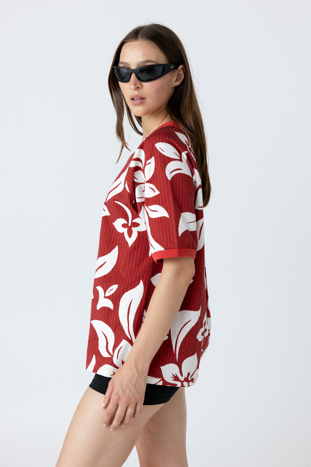 A relaxed fit jersey featuring a fine stripe, with an open V neckline that creates an easy, effortless look. The statement all over Hawaii inspired print brings a bold, sun soaked feel to your everyday wardrobe. Oversized short sleeves and a roomy silhouette offer laid back comfort, while the straight hemline can be worn tucked in or loose depending on your style. Crafted for breathable softness and easy movement.