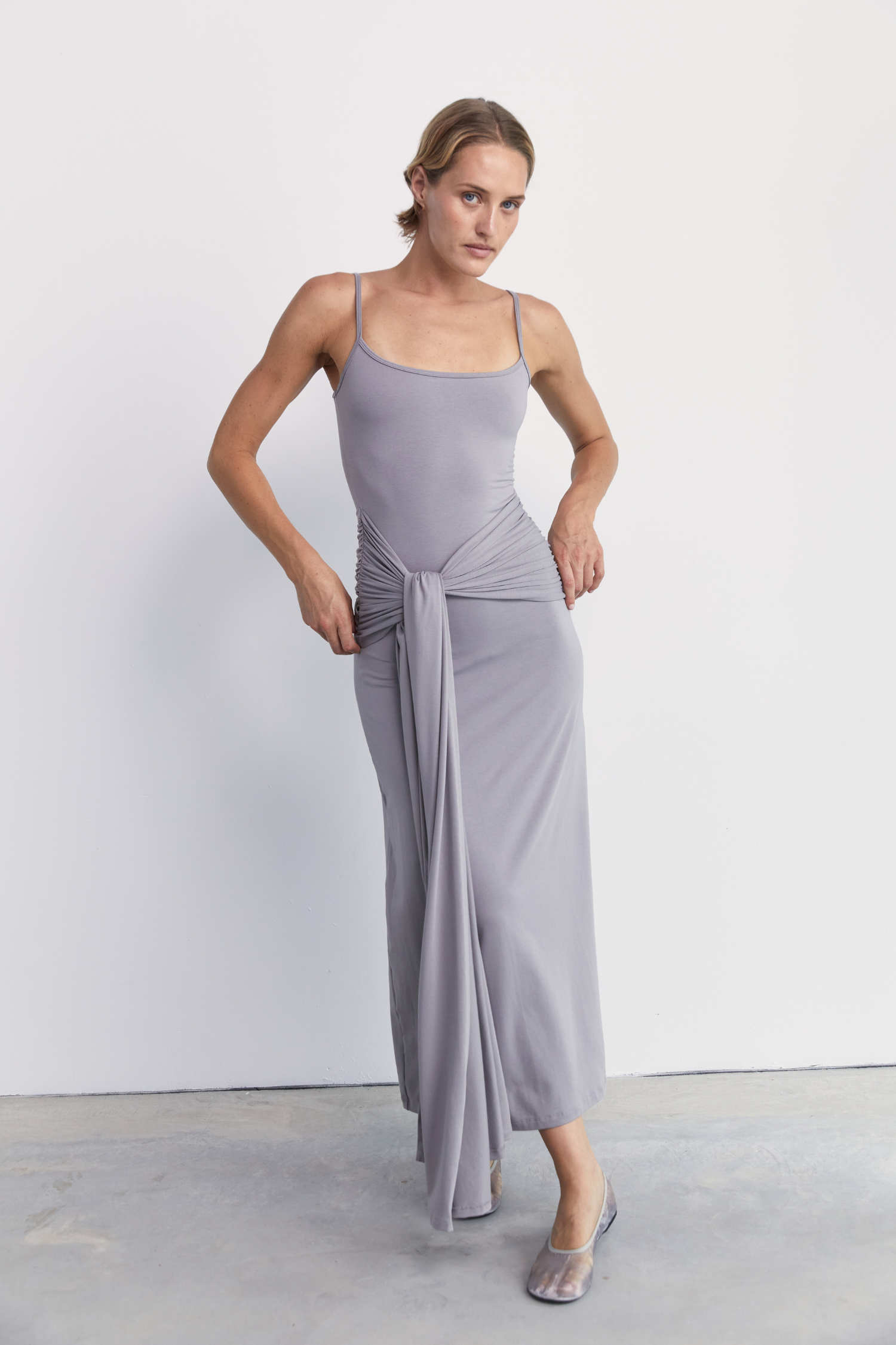 A mid length wrap dress created with elegant waist wrap detailing that flatters your natural shape. The smooth blend of Bamboo, Organic Cotton and Spandex offers soft movement and all day comfort, making it a refined essential for warm weather, effortless layering and all-day-wear.